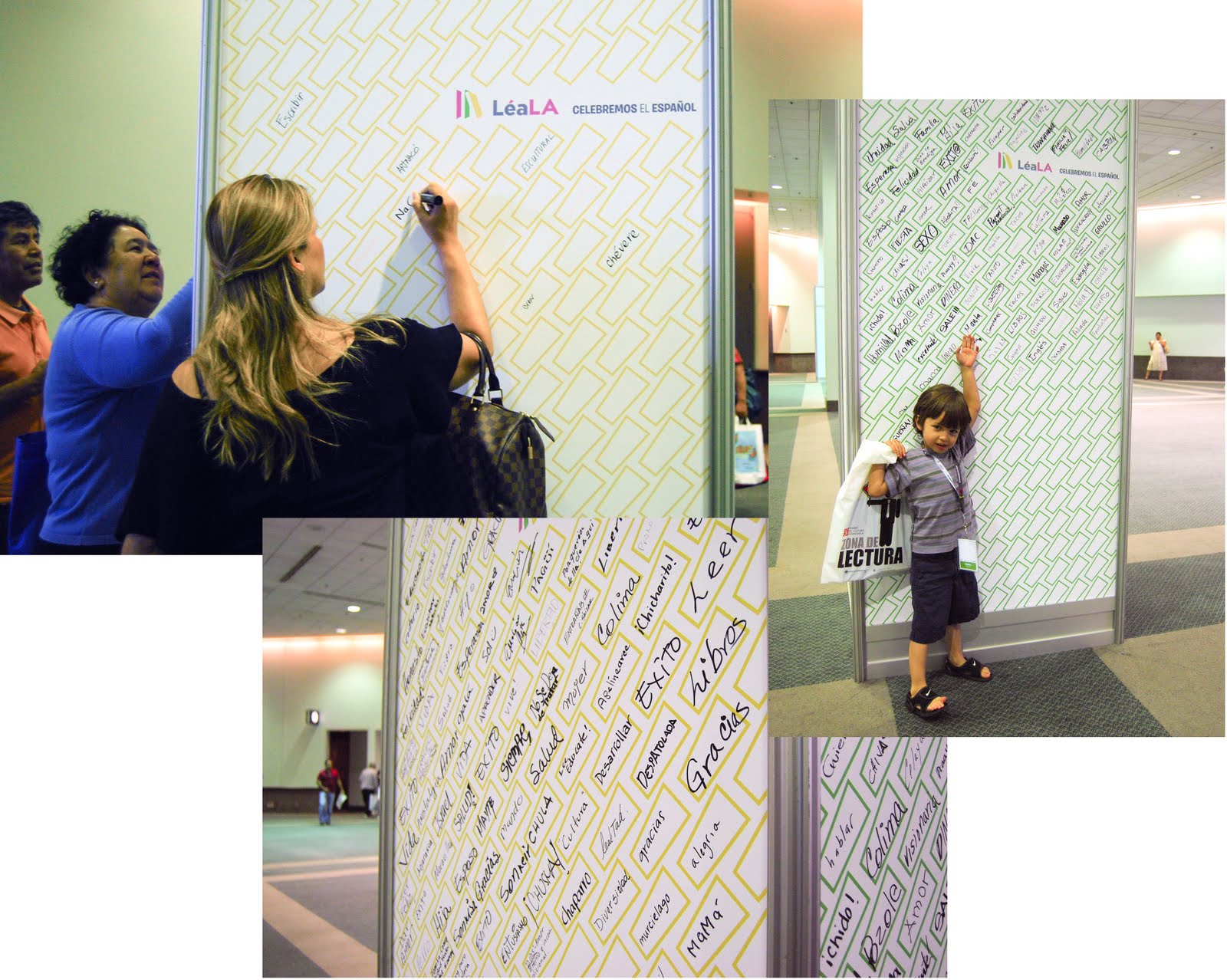 En un gran espacio todas las columnas estaban forradas con este papel para qeu os visitantes escribieran la palabra favorita en español, que chévere!! Cuál crees que fué la mía? (Mira a la derecha de la muchacha que escribe!)