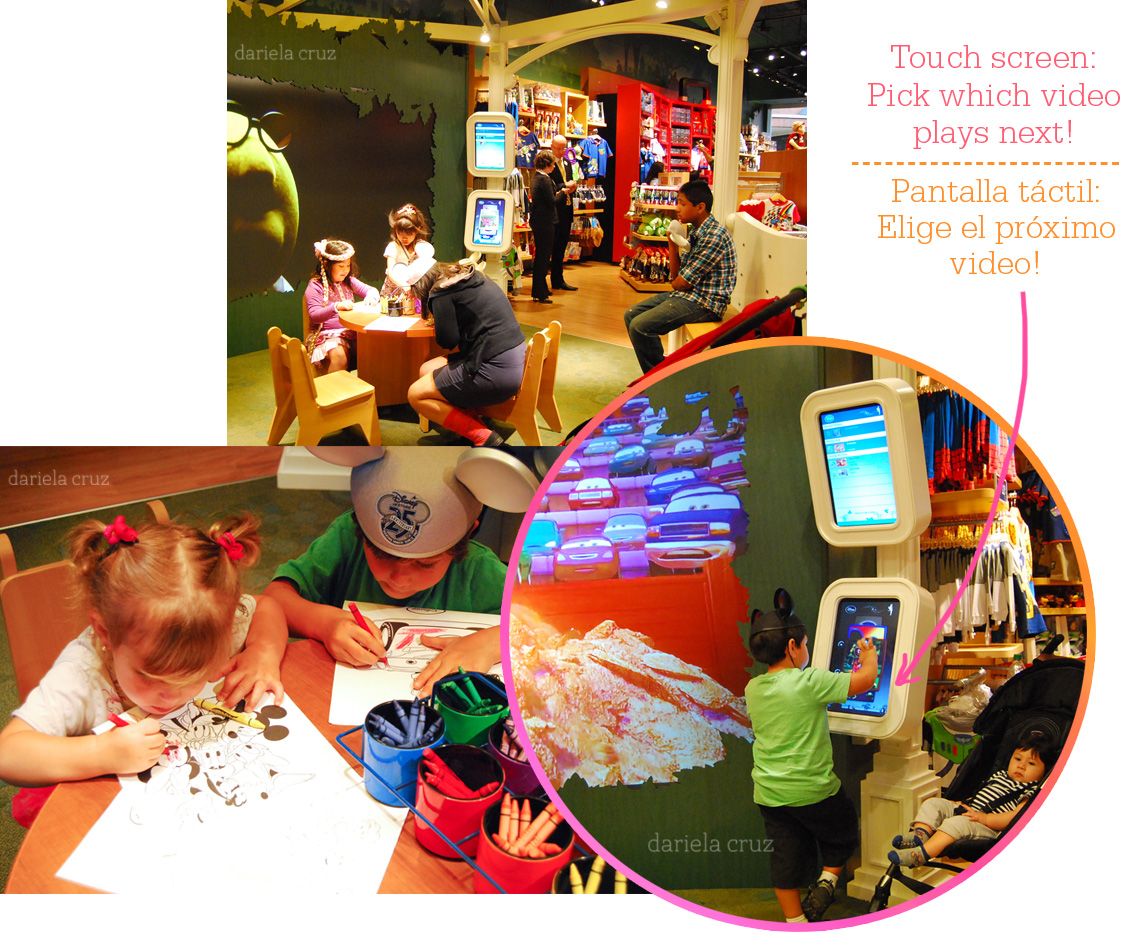 My favorite part was the Theater, I think all stores (not only Disney) should have this! There is a table for kids to color at and the best part: the videos on the screen are chosen by anybody that selects them with the touch screen on the side, it’s awesome! I saw kids of all ages going through it.