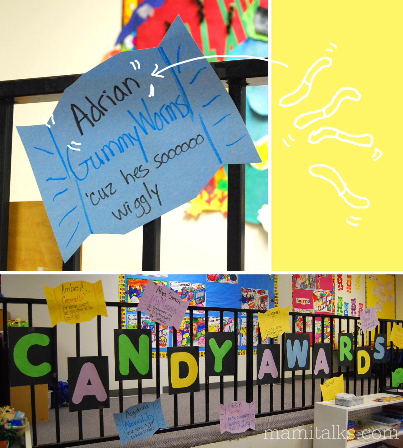 The teacher did what she called The Candy Awards and Adrian got the Gummy Worms because he is so wiggly! The awards were awesome and so creative, in their bags each kid got the actual candy!
