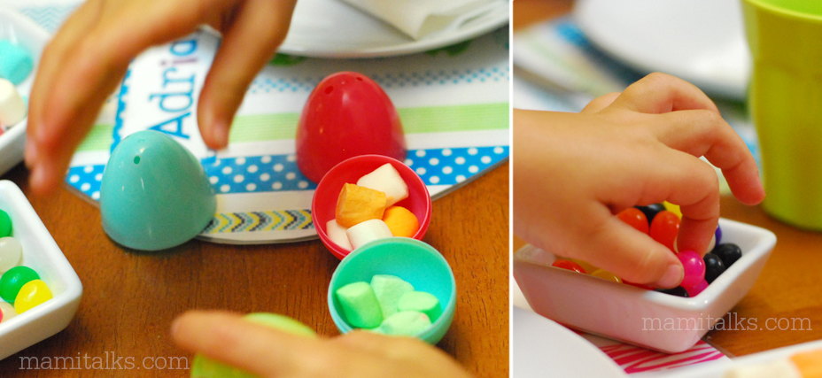 Después de que puse la mesa así para las fotos dejé que los niños jugaran y empezaron a rellenar los huevitos de plástico ellos mismos. Nunca lo han hecho ellos y entonces pensé que chévere esta actividad…