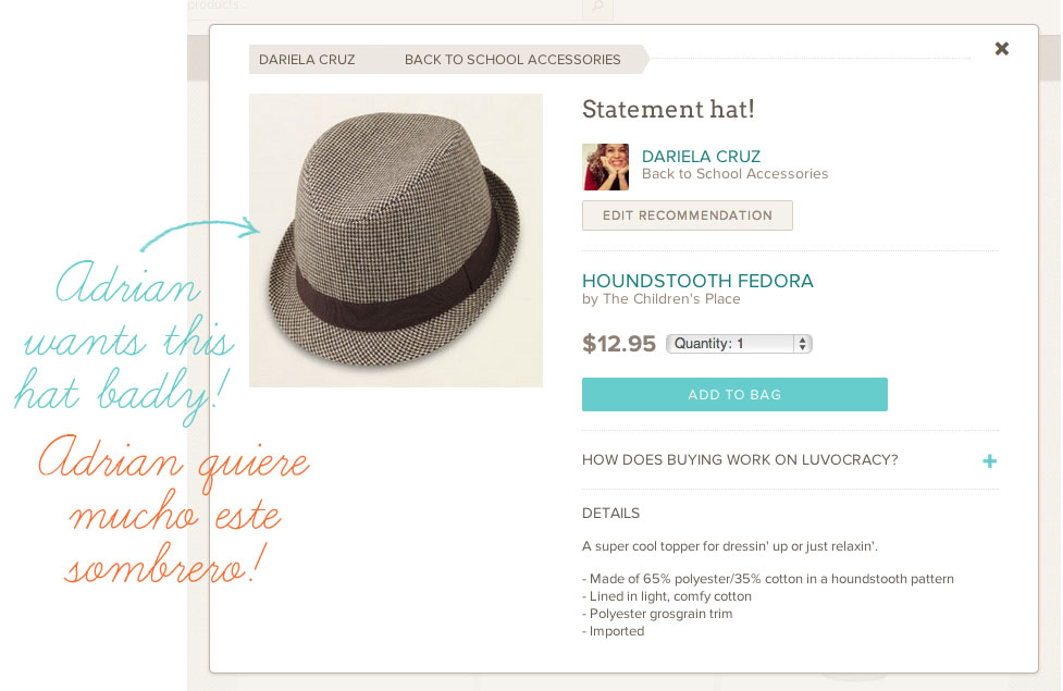 Luvocracy is a site to shop, the fun part about it is that you can shop from anywhere in the internet through Luvocracy, so if you find something in Target and another in Amazon and another on an Etsy shop you can select them all in Luvocracy and shop for the 3 pieces all together without having to do 3 transactions.