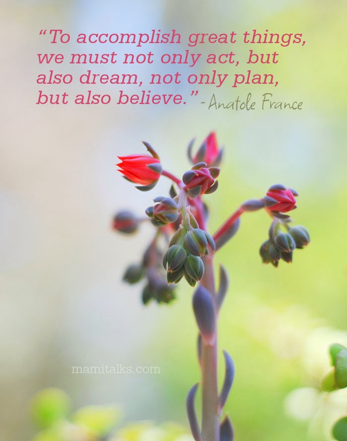 Esta foto la tomé en mi patio, es una planta que me dió mi mamá y aunque soy tan terrible con las plantas es tan increible como siguen viviendo y hasta le salen florecitas (ni les cuento que vinieron pajaritos a las flores!). Esta foto me inspira a seguir, a estar motivada y tal y como dice la cita: A creer!