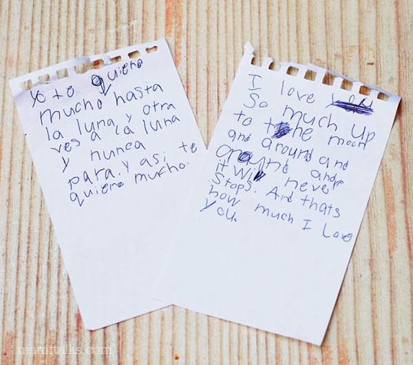 The other day Adrian decided to write these notes for us at the same time, one for me and one for Daddy. I didn’t realize until later when I took a look at Derek’s note that it said the exact same thing as mine but in English ♥. I almost cried. I know that he is bilingual and that he is getting amazing at reading and writing both languages but to demonstrate it like this, out of his own initiative, it’s different.