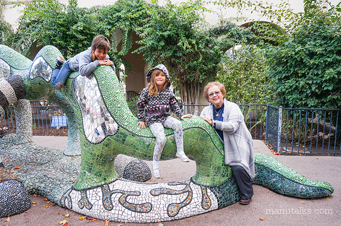 This sculpture is called Nikigator and it’s by Niki de Saint Phalle, she’s my favorite artist ever and there are many sculptures of hers in San Diego, many of them for kids to play in too (like this one from our staycation). She was originally French and lived in San Diego in her late years for a long while. Every time we come across her art I go back and read about her life and works. I feel like I need a book about her and I will memorize it all, is that weird?